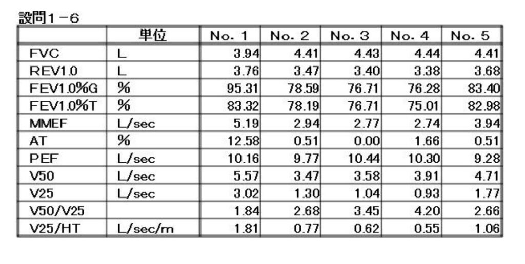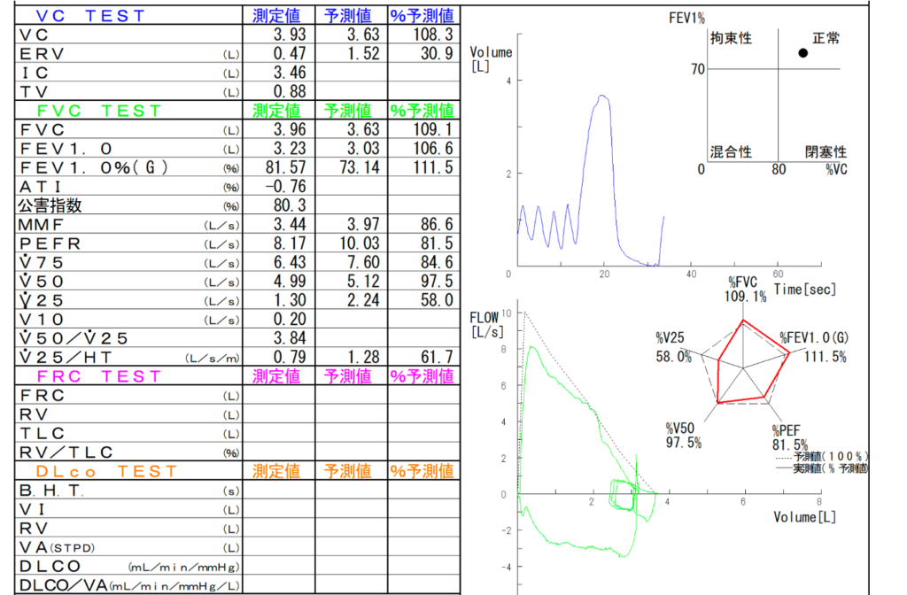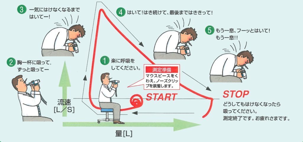 VC test、FVC testと行うと、肺機能障害を評価することができます。