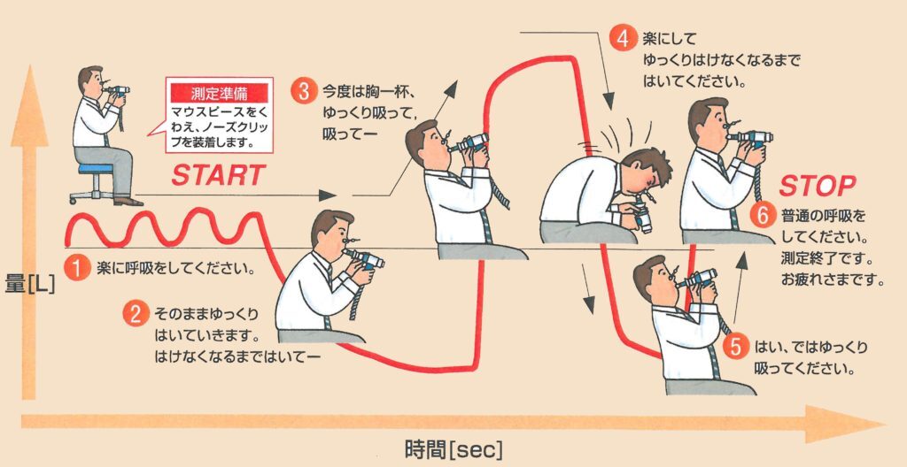 肺活量測定(VC test)と努力性肺活量測定(FVC test)の2種類があります。