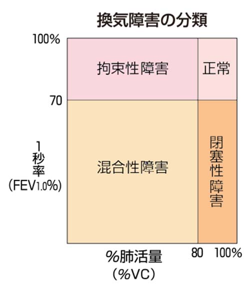 国家試験でもよく問われるものですが、1秒率FEV1.0%と%VCから上記の4つに分類されます。